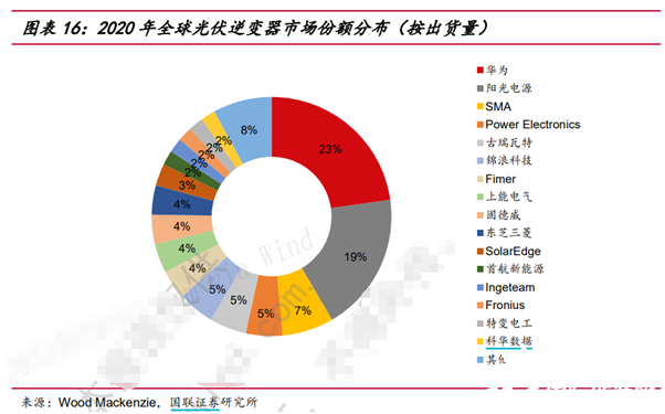 據Wood Machenzie,2020年全球光伏逆變器企業出貨量Top10中國內企業占6席,華為和陽光電源構成了全球光伏逆變器企業的第一梯隊,2020年出貨量分別為41.7GW和35.0GW,占全球出貨量的23%和19%。中國企業Top6占據全球光伏逆變器出貨量60%的市場份額,且集中度還在上升趨勢中。