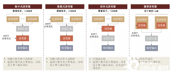 光伏逆變器主要有集中式、集散式、組串式逆變器和微型逆變器4種。這四種類別的主要區別在于逆變器的單體容量以及直接與逆變器連接的光伏組件數量不同,由此具有不同的下游應用場景。