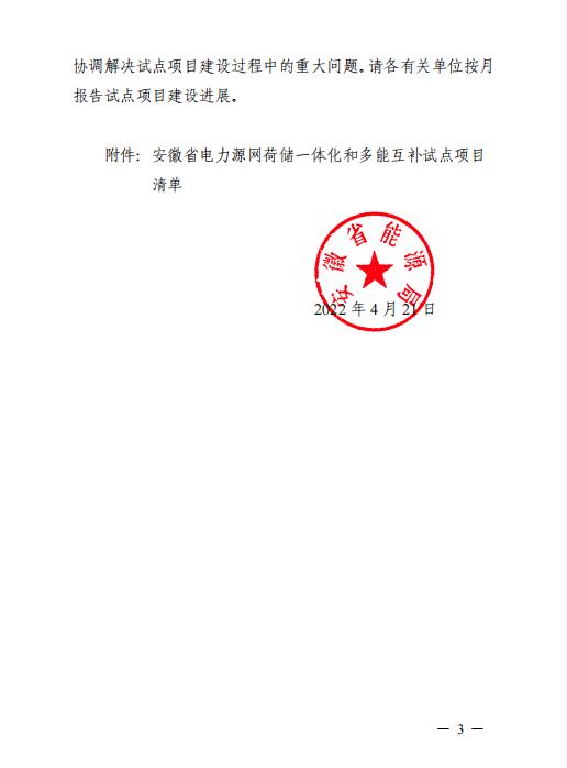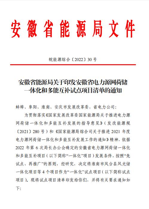【國際能源網 訊】近日,安徽省能源局關于印發安徽省電力源網荷儲一體化和多能互補試點項目清單的通知,將淮南市鳳臺縣風光儲一體化項目等4個項目作為“一體化”試點項目,項目規模共計451萬千瓦,其中2022年下達風電光伏發電建設規模共計116萬千瓦。具體如下: