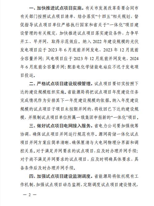 根據要求,納入2022年建設規模的光伏發電項目應于2023年6月底前并網發電,2023年12月底前全容量并網;風電項目應于2023年12月底前并網發電,2024年6月底前全容量并網;配套電化學儲能電站應不遲于發電項目投運。