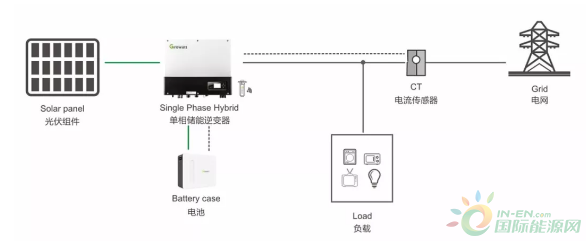2 加裝儲能裝置 加裝防逆流裝置,成本比較低,但會(huì)浪費(fèi)一些光伏發(fā)電,適合于短時(shí)間小功率的系統(tǒng),如果光伏裝機(jī)大于負(fù)載功率,或者長時(shí)間大于負(fù)載功率,建議使用儲能裝置。如下圖所示,系統(tǒng)由光伏組件,儲能逆變器、蓄電池、電流傳感器、負(fù)載等組件,當(dāng)檢測到有電流流向電網(wǎng)時(shí),啟動(dòng)雙向變流器,把多出的電能儲存在蓄電池中,等需要時(shí)再放出來。