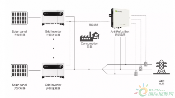 古瑞瓦特根據(jù)應(yīng)用環(huán)境的不同,開發(fā)了兩種防逆流方案,一種是單機(jī)防逆流方案,一臺逆變器配一個(gè)雙向數(shù)字電表或電流傳感器CT,逆變器和電表通過485接口通信,雙向電表安裝在并網(wǎng)點(diǎn),當(dāng)逆變器檢測到電表有電流流向電網(wǎng)的,立即改變工作模式,從MPPT最大功率跟蹤工作模式轉(zhuǎn)到控制輸出功率工作模式,逐漸降低功率直至輸出電流為零。這種方式適合于80kW以下的單機(jī)模式,接線簡單,成本低,方便可靠,要求逆變器有485接口。