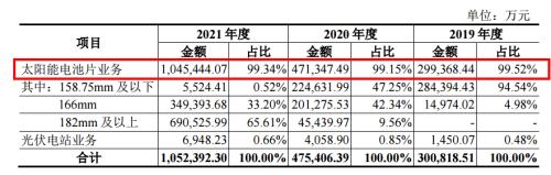 從收入構(gòu)成來看,2019-2021年各期,潤陽股份太陽能電池片業(yè)務(wù)收入分別約為29.94億元、47.13億元和104.54億元,占當(dāng)期主營業(yè)務(wù)收入比重分別約為99.52%、99.15%和99.34%。